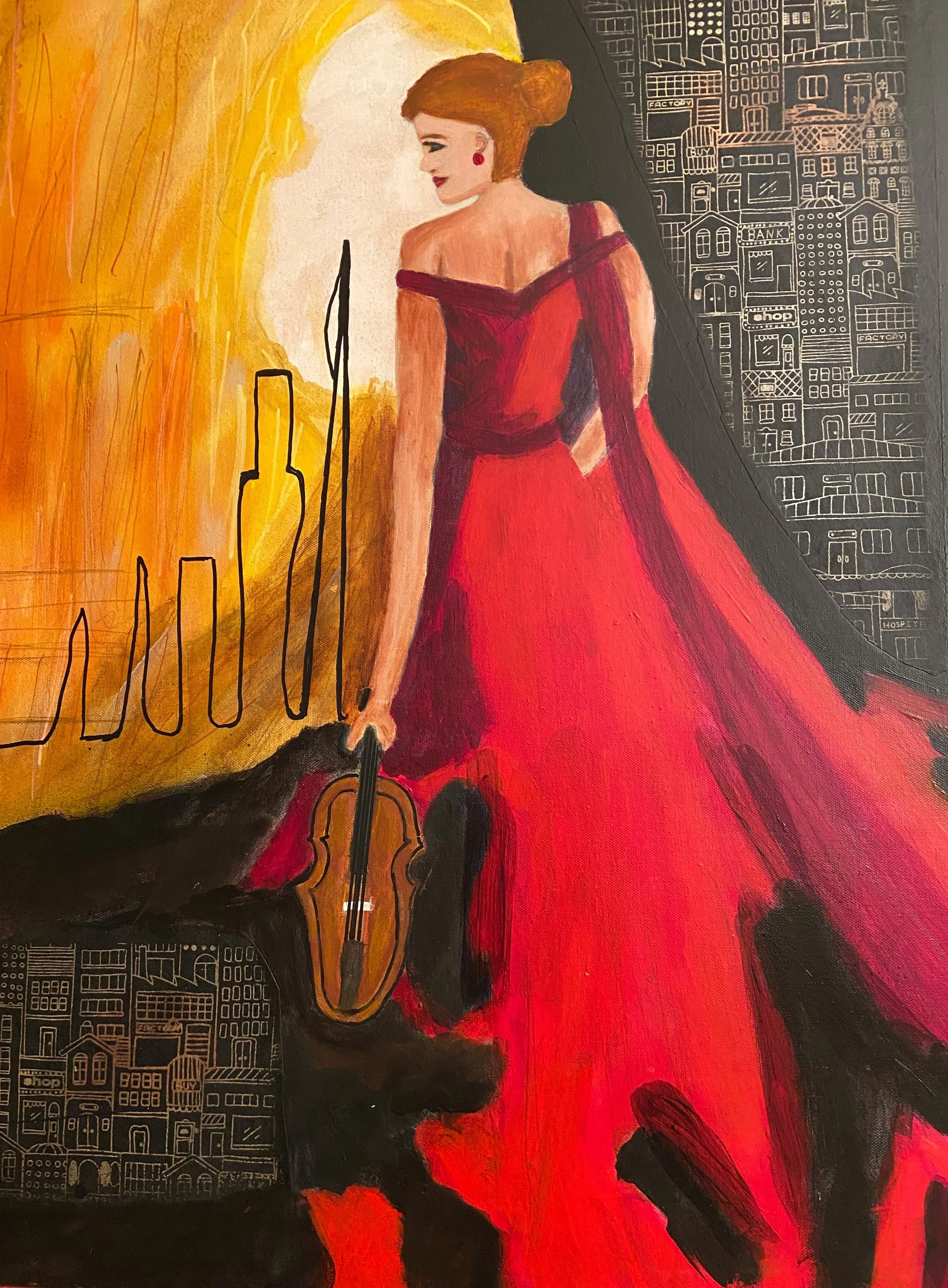 The girl had studied the violin for many years as a child in a rural setting. Her musical career had grown so successfully that she was selected to play her violin for the Chicago Symphony Orchestra which took her to the city to perform in front of a large audience. She not only performed eloquently but the entire audience was mesmerized by her beauty in the red dress.
